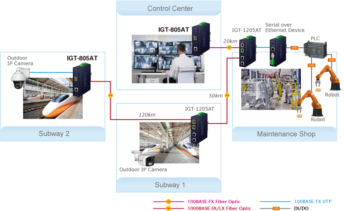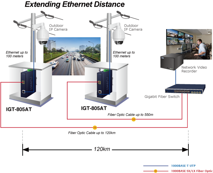 The mini-GBIC SFP slots built in the IGT-805AT support dual speed as it features 100BASE-FX and 1000BASE-SX/LX SFP (Small Form-factor Pluggable) fiber-optic modules. Now the administrator can flexibly choose the suitable SFP transceiver according to not only the transmission distance, but also the transmission speed required. The distance can be extended from 550 meters to 2km (multi-mode fiber) and up to 10/20/40/60/80/120 kilometers (single-mode fiber or WDM fiber). They are well suited for applications within the enterprise data centers and distributions.