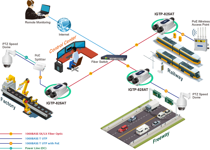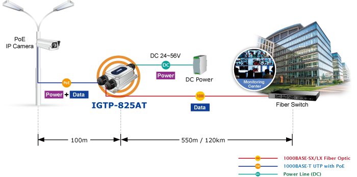 The maximum distance between a PoE PSE (power sourcing equipment) and a PD via Ethernet UTP cable is 100 meters. To flexibly extend the PoE deployment range, the IGTP-825AT’s SFP slot, supporting a 1000BASE-X SFP module, can extend the distance from 550m to 120km.