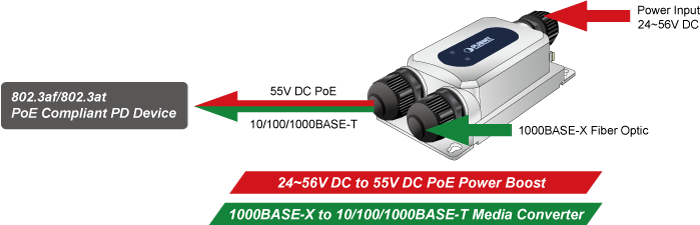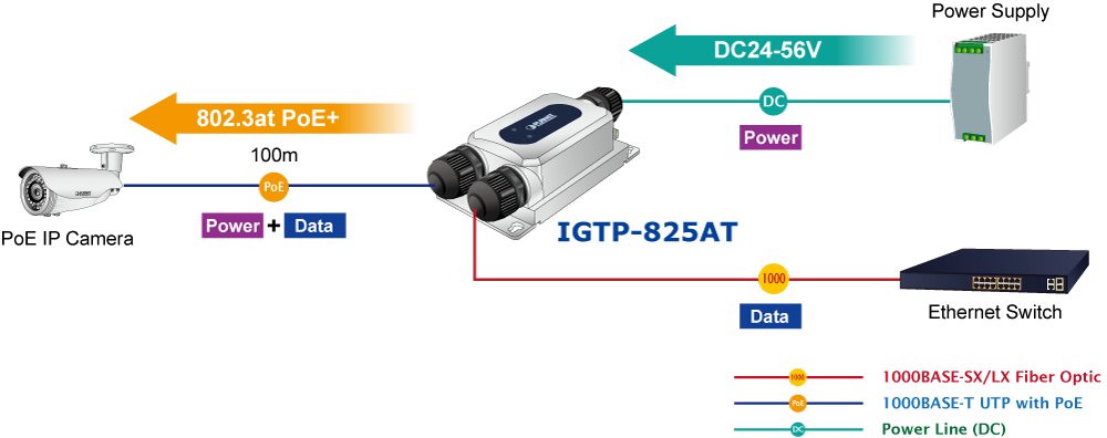 The IGTP-825AT can deliver up to 30-watt 55V DC power over Cat.5/5e/6 Ethernet cables, doubling that of the earlier 802.3af. It is also backward compatible with 802.3af PoE standards to allow users to flexibly deploy standard and high powered devices simultaneously with no need for software configuration. With data and Power over Ethernet from one unit, the IGTP-825AT can reduce cable deployment and eliminate the need for dedicated electrical outlets on the wall, ceiling or any unreachable place.