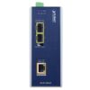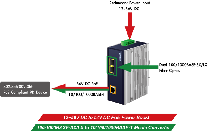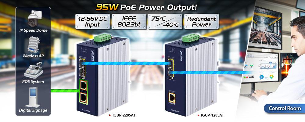 PLANET IGUP-1205AT Industrial Gigabit Media Converter combines Ethernet media conversion (from 100/1000BASE-X to 10/100/1000BASE-T) with 802.3bt Power over Ethernet Plus Plus (PoE++) injector function to deliver up to 95 watts of power output and high data transmission speed to PDs (powered devices) installed in a remote area where sufficient and reliable power input is required. Its 100/1000BASE-X fiber optic uplink port provides long distance, high speed and stable data transmission to a remote core network. The special and convenient power system of the IGUP-1205AT supports dual 12~56V DC power inputs for power redundancy and operational flexibility.