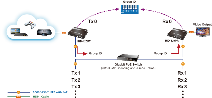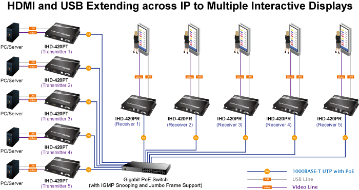The IHD-420 series allows a network configuration via a central computer over the same LAN within a certain distance. By fully leveraging the Gigabit Ethernet switches with 802.1Q VLAN function, multi-casting can be performed to allow more video sources/senders in the network and be remotely managed. Adjusting and matching video channel setting is simple with the DIP switch on both the IHD-420PT and IHD-420PR. The video distribution is easily deployed through Plug and Play.