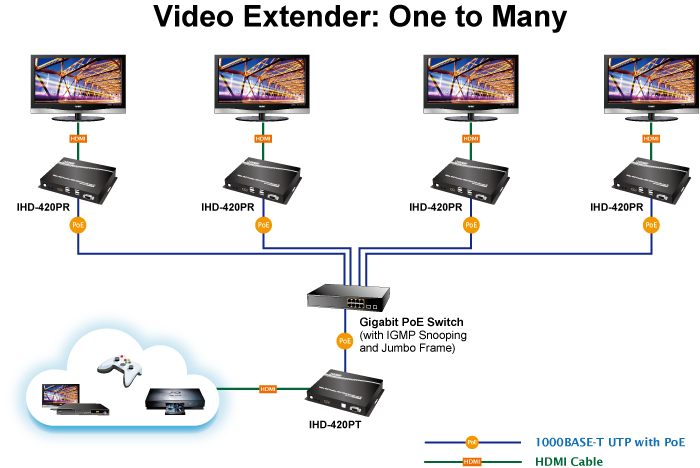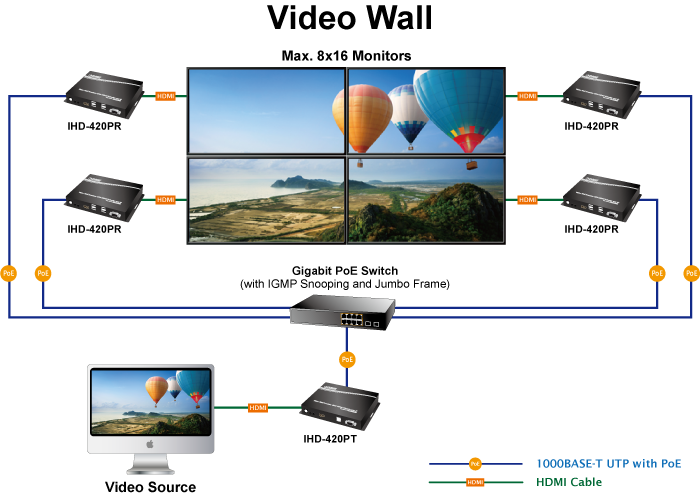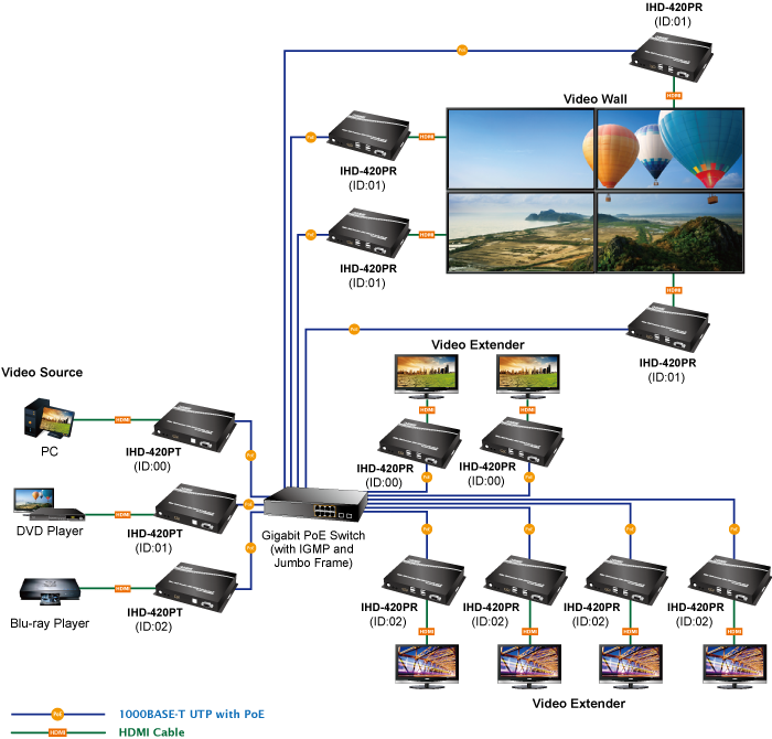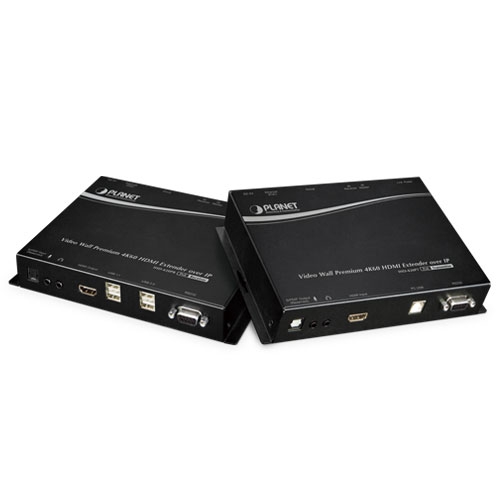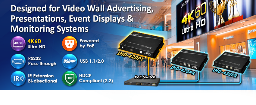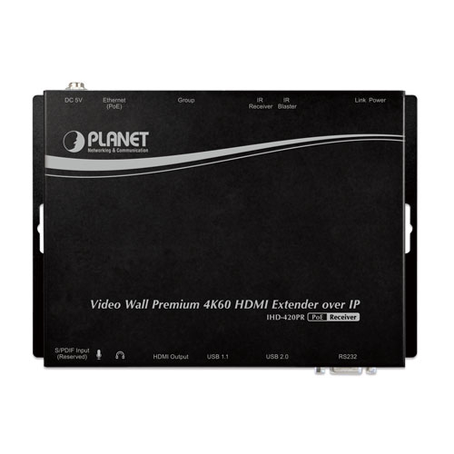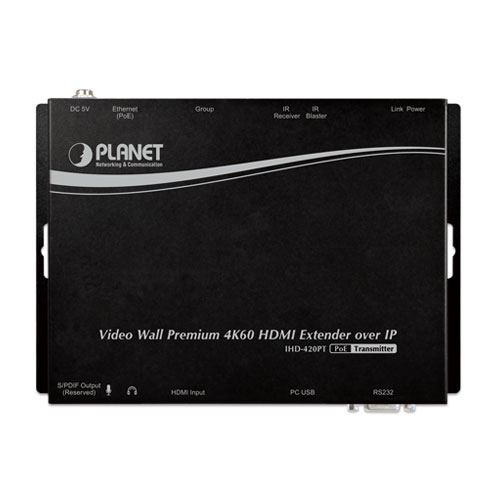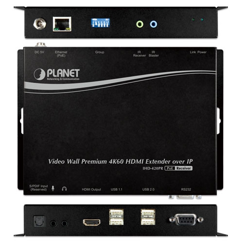 PLANET IHD-420 HDMI/USB Extender Video Wall over IP with PoE delivers a great 4K video distribution solution with refreshing 60 frames per second , waking an efficient and effective advertising deployment. The IHD-420 series is the combination of the transmitter, IHD-420PT, and the receiver, IHD-420PR. They can be used as an audio, video and IR extender over IP, and applied to point to point, point to multi-point, multi-point to multi-point and eye-catching video walls of up to 16 by 8 displays.