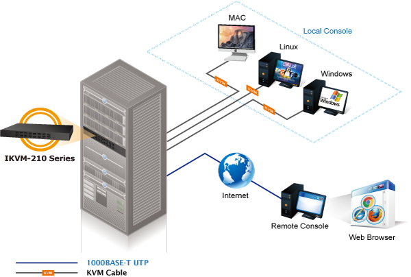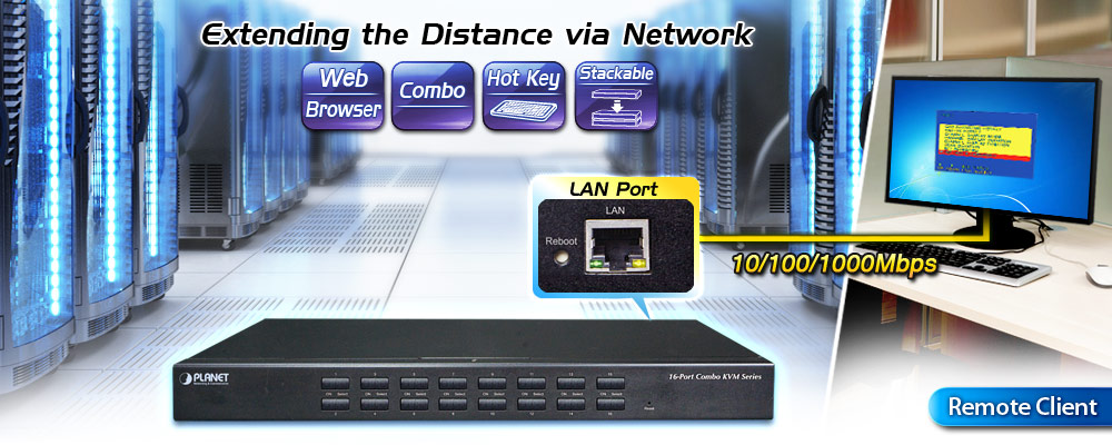 PLANET offers an ideal enterprise 16-port KVM switch solution for company server room or testing facilities. With the innovative IP-based technology, PLANET has turned the traditional KVM switches into true networking devices. The IKVM-210-16 captures, digitizes and compresses video signal, and then transmits it with keyboard and mouse signals through IP network. Multiple remote sites can monitor the same PC server simultaneously.