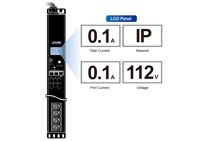 The LCD panel on the unit shows the aggregate current drawn from a power outlet. This feature aids installers in preventing overloaded circuits by issuing a visible warning when the current draw approaches the strip’s maximum amperage.
