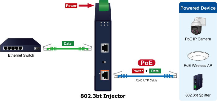 PLANET IPOE-171-95W is a Single-Port, Industrial 802.3bt Power over Ethernet Injector with a maximum of up to 95 watts of power output over Ethernet cables. It is also equipped with two 100M/1G/2.5G/5GBASE-T RJ45 copper interfaces to handle extremely large amounts of data transmission.