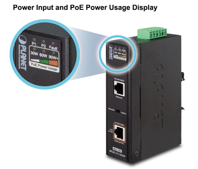 The IPOE-171-95W helps users to monitor the current status of power input and PoE power usage easily and efficiently via its advanced LED indication. “Power Input” allows user to know the status of power input. “PoE Power Usage” displayed on the panel of the IPOE-171-95W has three LED indicators of different power usages. Via the power usage LED, the IPOE-171-95W enables the administrator to monitor the status of the power usage of the connected PDs in real time.