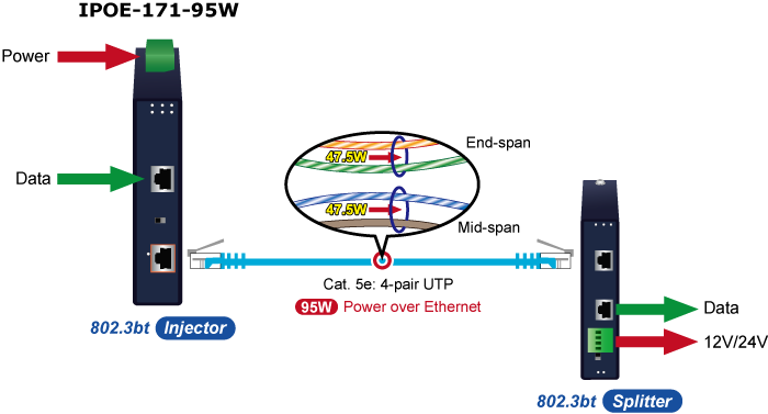 Instead of delivering power over 2-pair twisted UTP – be it end-span (Pins 1, 2, 3 and 6) or mid-span (Pins 4, 5, 7 and 8), the IPOE-171-95W provides the capability to source up to 95 watts of power by using all the four pairs of standard Cat. 5e/6 Ethernet cabling.