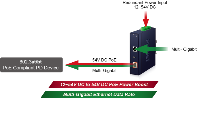 To facilitate the 802.3bt PoE++ usage with commonly used 12~54V DC power input for transportation and industrial-level applications, the IPOE-171-95W adopts 12~54V DC to 54V power boost technology to solve power source issue but does not require special power supplies. The IPOE-171-95W provides an integrated power solution with a wide range of voltages (12~54V DC) for worldwide operability. It also provides dual-redundant, reversible polarity 12~54V DC power supply inputs for high availability applications.