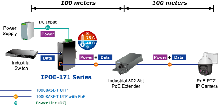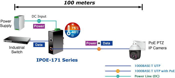 Today, the PoE demand expands from commercial applications to many critical networks in the harsh environment. The IPOE-171 series will be one of the ideal solutions that provide a high level of immunity against electromagnetic interference and heavy electrical surges typical of environments found on plant floors or in curb side traffic control cabinets. The IPOE-171 series can operate stably under temperature range from -40 to 75 degrees C which enables the users to conveniently apply the device in almost any location of the network. The IPOE-171 series is also equipped with a compact IP30 standard metal case that allows either DIN-rail or wall mounting for efficient use of cabinet space.