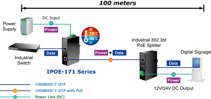 The IPOE-171-95W delivers the Ethernet digital data with 54V DC power over the twisted-pair cables as a 95-watt Power over Ethernet Injector, and the connected ultra Power over Ethernet splitter, the IPOE-173S, will separate the digital data and the power into three optional outputs (12V/24V DC) with distance up to 100 meters.