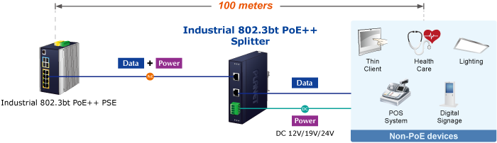 • applications_tab: <strong>802.3bt PoE++ Switch and Splitter Installation</strong> For a place which is hard to find the power inlet, the IPOE-173S separates digital data and power into three optional outputs<strong> (12V/19V/24V DC)</strong> to non-PoE devices such as laptops, PTZ (pan, tilt & zoom) IP cameras, color touch-screen IP phones, multi-channel wireless LAN access points and other network devices at distance up to 100 meters. <img style="display: block; margin-left: auto; margin-right: auto;" src="https://www.planet.com.sa/planet-storage/2025/01/IPOE-173Sv2-4.png" alt="" width="700" height="244" />