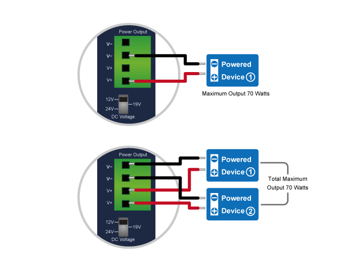 The IPOE-173S shares its 70-watt output power with not only one power-hungry device but also two non-PoE Ethernet devices simultaneously through a 4-pin terminal block. For example, the two power output can be applied as shown below to completely solve the need of electric source: