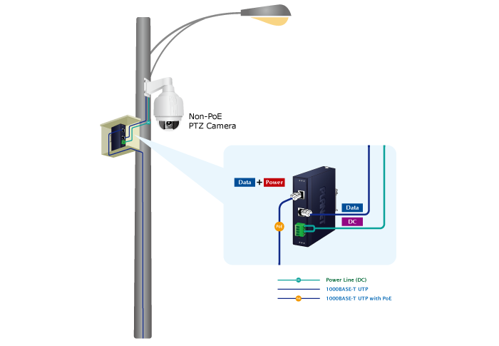 For a place which is hard to find the power inlet, the IPOE-173S separates digital data and power into three optional outputs (12V/19V/24V DC) to non-PoE devices such as laptops, PTZ (pan, tilt & zoom) IP cameras, color touch-screen IP phones, multi-channel wireless LAN access points and other network devices at distance up to 100 meters.