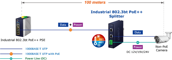 PLANET IPOE-173S is an Industrial-grade 802.3bt Power over Ethernet Splitter which delivers the Ethernet digital data and PoE power from an 802.3bt PoE++ type-4 PSE (power source equipment) over an UTP cable. It comes with a selectable 12V/19V/24V DC DIP switch, enabling to deliver a maximum of 70-watt power output to a non-PoE device. It supports passive 10/100/1000Mbps Ethernet connection and distance up to 100 meters. To fulfill the growing industrial applications, the IPOE-173S is designed to work under the operating temperature range from -40 to 75 degrees C. The IPOE-173S is an ideal solution to transfer power to a traditional network device with high power demand directly without the need to install additional power outlets and electrical cabling in the industrial environment.
