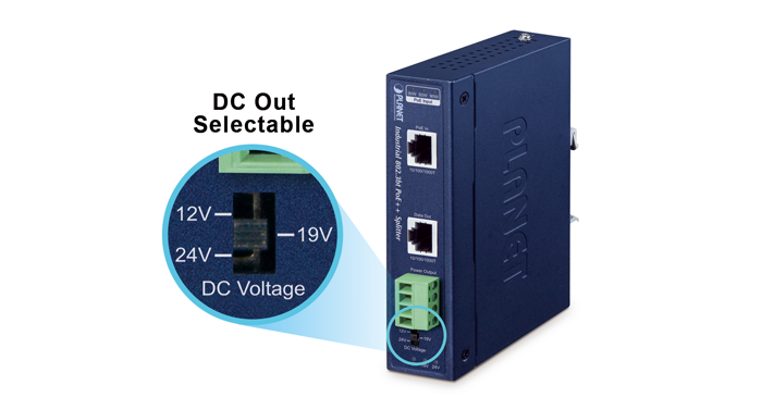 • product_editor_4421_tab_content: <strong>Interface</strong> <ul> <li>2 RJ45 interfaces</li> <li>1-port <strong>Data + Power input</strong></li> <li>1-port <strong>Data output</strong></li> <li>2 DC output (4-pin terminal block)</li> <li>1 12V/19V/24V DC DIP switch</li> </ul>   <strong>Power over Ethernet</strong> <ul> <li>Complies with 802.3bt PoE++ Power over Ethernet end-span / mid-span PSE</li> <li>Backward compatible with 802.3at PoE+</li> <li>Splits the PoE power over RJ45 Ethernet cable into 12V/19V/24V DC output</li> <li>Supports power output up to 70 watts</li> <li>Remote power feeding up to 100 meters</li> </ul>   <strong>Hardware</strong> <ul> <li>IP30 slim metal case</li> <li>DIN-rail or wall mount design</li> <li>Supports high surge/ESD protection</li> <li>-40 to 75 degrees C operating temperature</li> </ul>