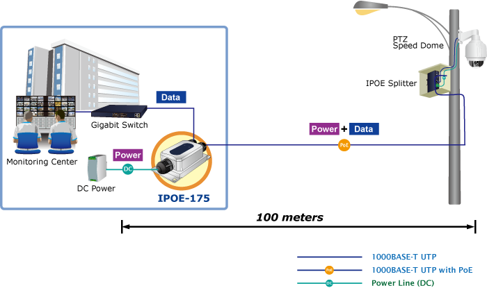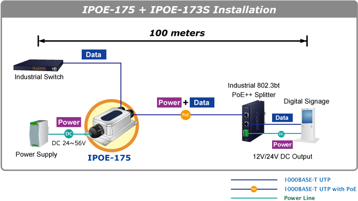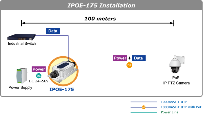 The IPOE-175 can deliver 60-watt 54V DC power over Cat.5/5e/6/6A Ethernet cables which allow data and power to transmit simultaneously through the cable between the Injector (IPOE-175) and PoE PD or PoE++ Splitter (IPOE-173S). The maximum distance between the Injector and Splitter is 100 meters. As the IPOE-175 is also backward compatible with IEEE 802.3at PoE+ PD or PoE Splitter, the system administrator only has to use one single RJ45 Ethernet cable to carry both power and data to another device. It would make the network deployment easier and more reliable.