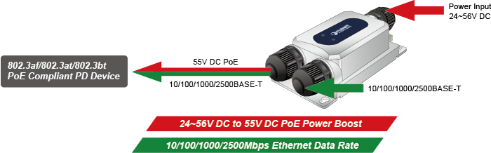 To facilitate the 802.3bt PoE++ usage with commonly used 24~56V DC power input for transportation and industrial-level applications, the IPOE-175 adopts 24~56V DC to 54V power boost technology to solve power source issue but does not require special power supplies. Its wide-ranging voltages design is suitable for worldwide operability with high availability applications requiring dual or backup power inputs.