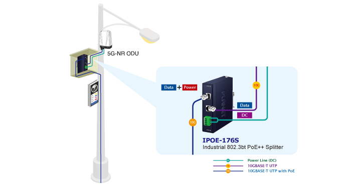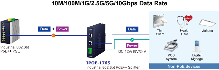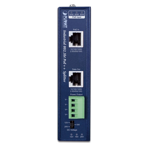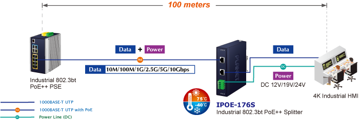 PLANET IPOE-176S is an Industrial-grade 802.3bt Power over Ethernet Splitter which delivers the Ethernet digital data and PoE power from an 802.3bt PoE++ type-4 PSE (power source equipment) over an UTP cable. It comes with a selectable 12V/19V/24V DC DIP switch, enabling to deliver a maximum of 70-watt power output to a non-PoE device. It is also equipped with two 10M/100M/1G/2.5G/5G/10GBASE-T RJ45 copper interfaces to handle extremely large amounts of data transmission. To fulfill the growing industrial applications, the IPOE-176S is designed to work under the operating temperature range from -40 to 75 degrees C. The IPOE-176S is an ideal solution to transfer power to a traditional network device with high power demand directly without the need to install additional power outlets and electrical cabling in the industrial environment.