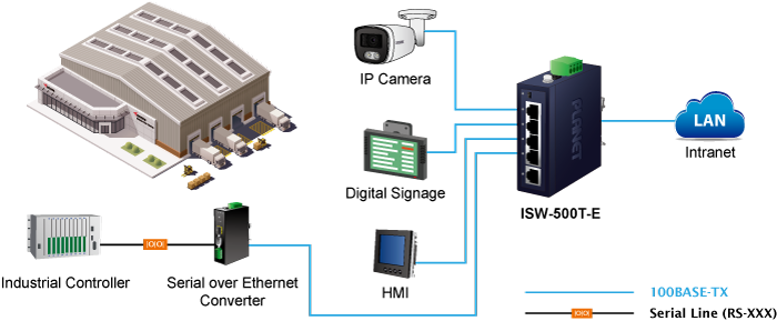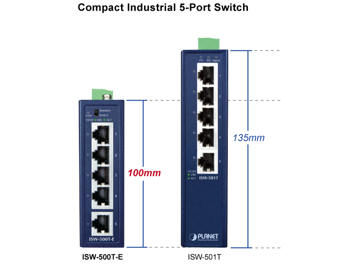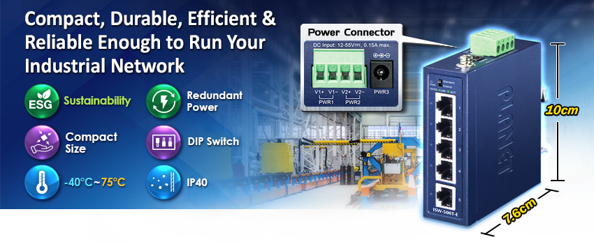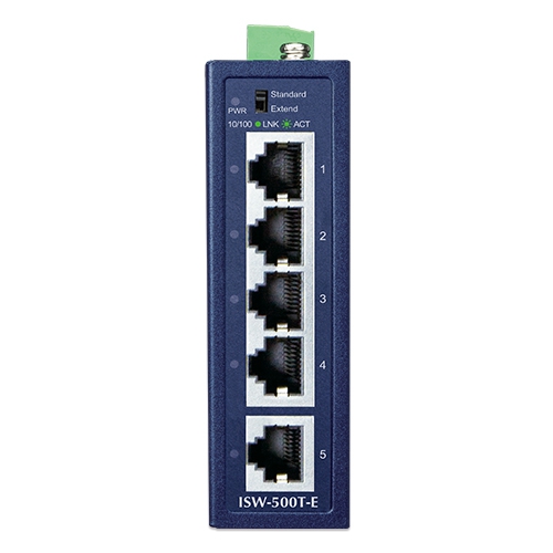 PLANET ISW-500T-E Compact Industrial 5-Port 10/100TX Ethernet Switch, suitable for industrial use, features 5 100Mbps auto-negotiation ports, IP40-rated rugged yet compact case and a wide-ranging redundant power system (12~55V DC). The ISW-500T-E is able to operate in any harsh environment with operating temperature ranging from -40 to 75 degrees C.