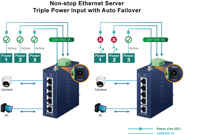 The ISW-500T-E features a robust triple power input system with wide-ranging voltages (12V~55V DC) incorporated into the customer’s automation network to enhance system reliability and uptime. In the example below, if one power supply fails, the hardware failover function will be activated automatically to keep powering the ISW-500T-E via the remaining power supplies alternatively, ensuring continuous operation without any interruptions.