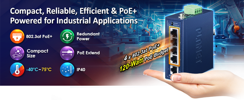 PLANET ISW-504PT-E Compact Industrial 4-Port 10/100TX 802.3at PoE + 1 Port 10/100TX Ethernet Switch, suitable for industrial use, features 5 100Mbps auto-negotiation ports, IP40-rated rugged yet compact case and a wide-ranging redundant power system (48~55V DC). The ISW-504PT-E is able to operate in any harsh environment with operating temperature ranging from -40 to 75 degrees C.