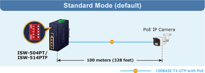 In the “Extend” operation mode, the ISW-504PT operates on a per-port basis at 10Mbps full duplex operation and can support 25-watt PoE power output over a distance of up to 250 meters, overcoming the 100-meter limit on Ethernet UTP cable.