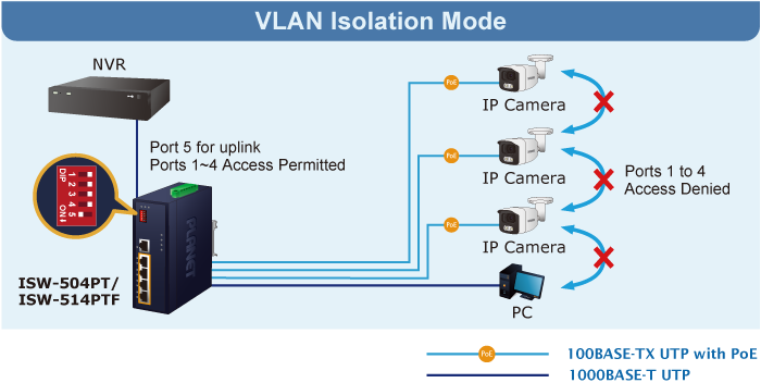 The ISW-504PT has a built-in solid DIP switch providing “Standard”, “VLAN” and “Extend” operation modes. By default, the ISW-504PT operates as a normal IEEE 802.3af/at PoE+ Switch in the “Standard” operation mode.