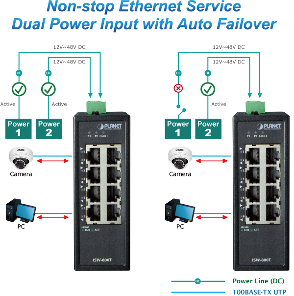 The ISW-800T features a strong dual power input system with wide-ranging voltages (12V~48V DC or 24V AC) incorporated into customer’s automation network to enhance system reliability and uptime. In the example below, when power supply 1 fails to work, the hardware failover function will be activated automatically to keep powering the ISW-800T via power supply 2 alternatively without any loss of operation.