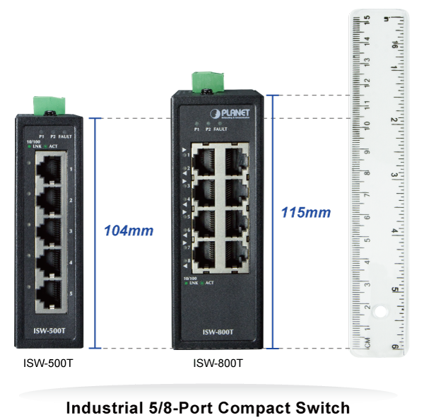 PLANET ISW-800T Compact Industrial 8-Port 10/100TX Ethernet Switch is tailored for industrial applications, featuring 8 auto-negotiation 10/100Mbps ports, an IP30-rated rugged yet compact case, and a versatile redundant power system (12~48V DC or 24V AC). The ISW-800T operates efficiently in harsh environments, with an operating temperature range of -40 to 75 degrees Celsius.