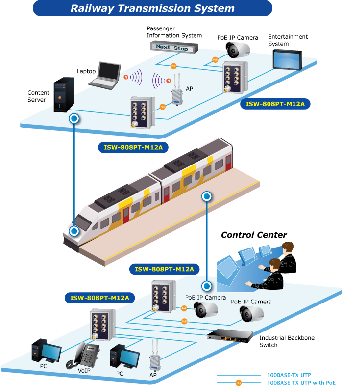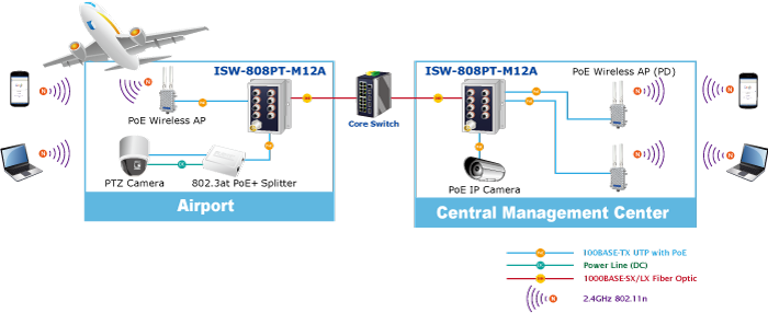 The flow control function enables the ISW-808PT-M12A to provide fast and reliable data transfer. All of the M12 RJ45 copper interfaces in the ISW-808PT-M12A support 10/100Mbps auto-negotiation for optimal speed detection through RJ45 Category 3, 4, 5, 5e, 6 cables. The standard auto-MDI/MDI-X support can detect the type of connection to any Ethernet device without requiring special straight-through or crossover cables.