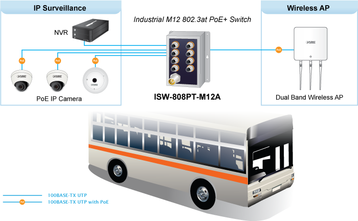 PLANET ISW-808PT-M12A is an industrial-grade robust and vibration-proof PoE+ switch for a wide range of applications in factories or moving trains as it guarantees a reliable performance under vibration and shock. It features eight 10/100BASE-TX auto-negotiation dustproof M12 connectors with IEEE 802.3at PoE+ injector function; each PoE+ port provides 36 watts of PoE output. The M12 connector provides tight and strong connection, and ensures stable Ethernet operating performance withstanding humidity, dirt, dust, shock, vibrations, heat and cold. The compact, IP50-rated metal case of the ISW-808PT-M12A allows either DIN-rail or wall mounting for efficient use of cabinet space.