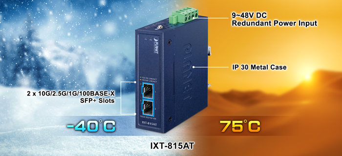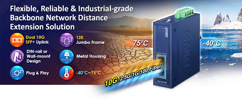 The PLANET IXT-815AT is the smallest compact industrial-grade 10G Ethernet media converter, delivering non-blocking wire-speed performance and exceptional flexibility for 10 Gigabit Ethernet extension in harsh industrial environments. It features dual 10G/2.5G/1GBASE-X and 100BASE-FX SFP+ fiber interfaces, housed in a rugged yet compact IP30-rated enclosure with a redundant power system and a wide operating temperature range from -40 to 75 degrees C.