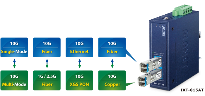 The IXT-815AT provides two 10G fiber ports that support both single-mode and multi-mode fiber, enabling conversion between PON and Ethernet. With fiber optic connectivity on both ends, the transmission distance can reach up to 120 km, significantly extending service coverage and deployment flexibility.