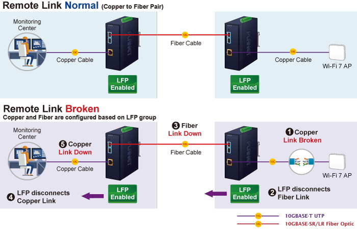 - This notification is then forwarded to other connected devices using Link Fault Pass-through.