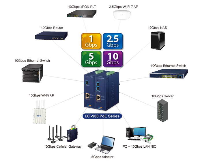 The IXT-900-1X1UP delivers a speed of up to 10Gbps over both copper and fiber-optic cabling, enhancing data transmission efficiency. Its 10GBASE-T copper interface with 5-speed auto-negotiation (10G/5G/2.5G/1G/100M) allows for high-speed data transfer over the existing Cat6/Cat6A cabling, avoiding costly upgrades. Furthermore, its IEEE802.3bt compatibility enables direct powering of Wi-Fi 7 APs, adding to its versatile network capabilities.