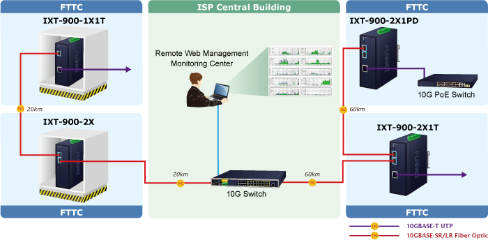 The IXT-900-2X offers two 10G fiber ports, which can be used for single mode and multimode conversion, as well as for converting between PON and Ethernet. Since both ports are fiber optic, the transmission distance can reach up to 80km on both ends, significantly extending the service coverage.