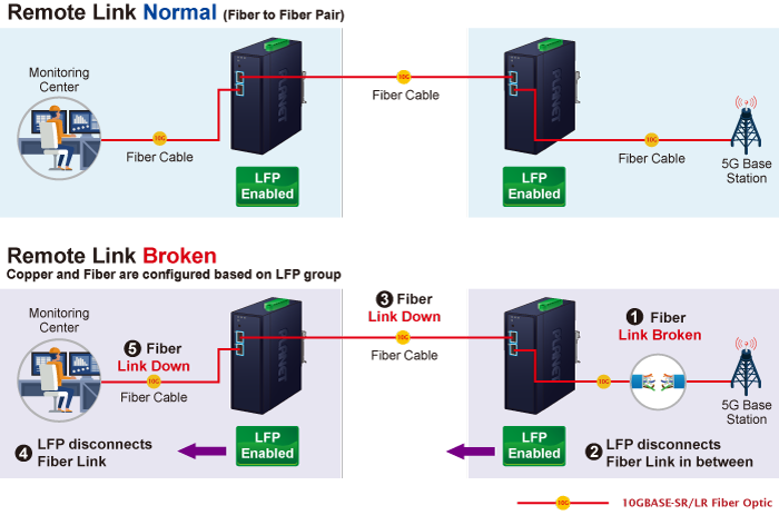 - This notification is then forwarded to other connected devices using Link Fault Pass-through.