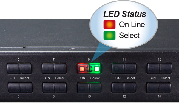 You could check the computer status on the front LED of the KVM-210-16. “Red” indicates that a computer is connected to the corresponding port and “Green” indicates that the computer connected to the corresponding port has focus.