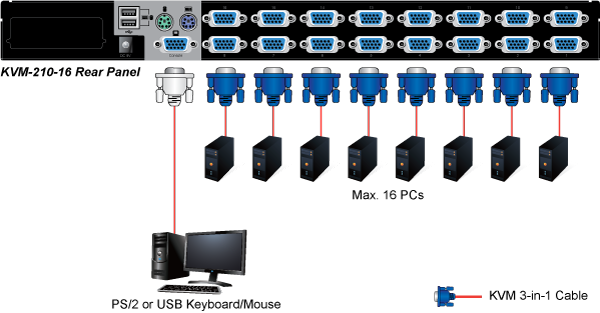 In the present computer applications, a mouse has become an indispensable device. The KVM-210-16 fully supports all models of PS/2 mice on the market. The KVM also supports the PS/2 keyboard port of code set 1/2/3 and further allows you to use the KVM for all kinds of servers, computers or their combination.