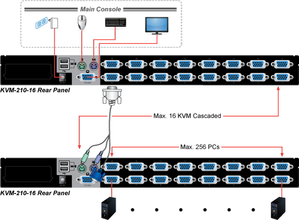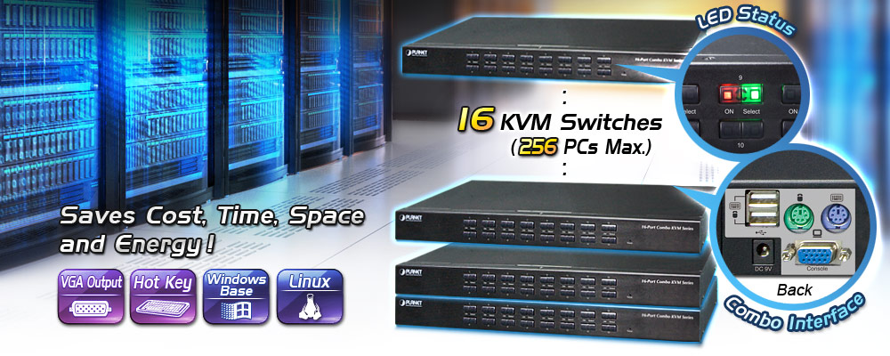 PLANET offers an ideal enterprise 16-port KVM switch solution for company server room or testing facilities. The KVM-210-16 16-port Combo KVM Switch features the patented design of the availability of USB and PS/2 interface connection, user-friendly OSD utility and daisy-chain function. The KVM switch solution frees up more table and rack space for users in addition to saving the cost of multiple keyboards, mice and monitors.
