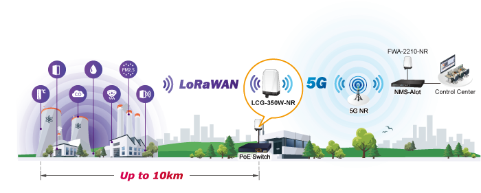 • applications_tab: <p><strong>Integrated LoRa and 5G NR Cellular Communication Solution</strong></p><p>PLANET LCG-350W-NR LoRaWAN Gateway is the solution for AIoT applications, seamlessly integrating LoRa, LoRaWAN, and 5G NR cellular technologies to provide superior performance and connectivity. Supporting both LoRa and LoRaWAN standards, the LCG-350W-NR allows transceivers to work with various LoRaWAN sensor devices such as temperature, humidity, water leak sensors, smoke detectors, and PM2.5 sensors. Additionally, legacy sensors can be connected via LoRa Node controllers, capturing and transmitting critical data over long distances through the LoRa wireless network.</p><p>The LCG-350W-NR then transmits the collected data via Ethernet or 5G NR to the Network Server, such as an AIoT device, which manages the network and efficiently distributes the data to the relevant applications. Thanks to the integration of the advanced 5G NR technology, the LCG-350W-NR surpasses the 100-meter limitation of RJ45 cables, enabling data transmission over vast distances without the constraints of wired connections. The LCG-350W-NR also includes advanced networking features such as VPN, Modbus, and comprehensive network management, making it highly versatile across various industries. </p><p><img style="display: block; margin-left: auto; margin-right: auto;" src="https://www.planet.com.sa/planet-storage/2025/01/LCG-350W-NR-61.png" alt="" width="700" height="281"></p>