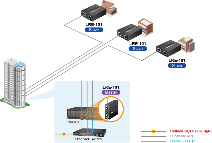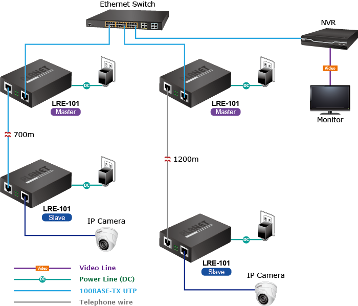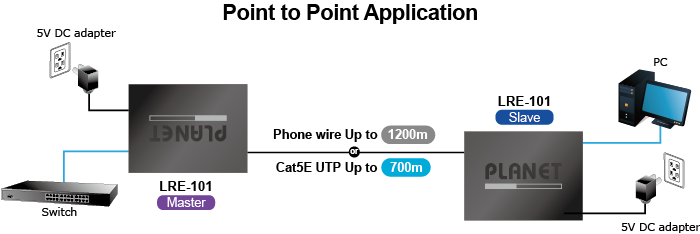 PLANET LRE-101 is also a Long Reach Ethernet (LRE) solution which provides a quick replacement and smooth migration solution from existing analog system to full digital system. A normal UTP cable can only be extended up to 100 meters, but with the LRE-101, the distance for Ethernet networking can be extended up to 700 meters (Cat.5E UTP) and 1200 meters (Phone wire), which are ideal for the following network applications: