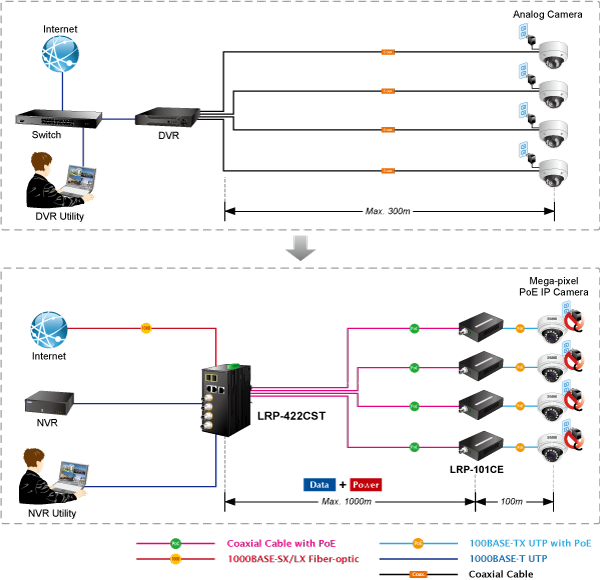 PLANET LRP-422CST, a brand-new Multi-channel Long Reach PoE Switch, features an extended Ethernet and PoE networking of up to 1 kilometer over the existing coaxial cables going to multiple PoE compliant devices. It provides IPv6/IPv4 dual stack management and built-in L2/L4 Gigabit Switching engine along with 4 BNC ports with Long Reach PoE Injector function, 2 Gigabit copper ports and 2 extra 100/1000BASE-X SFP fiber slots. Each of the BNC ports provides 36 watts of power with a total power budget of up to 150 watts. As an advanced PoE switch, the LRP-422CST features intelligent PoE functions to improve the availability of critical applications. It provides a quick, safe and cost-effective PoE network solution to upgrading the existing coaxial cable infrastructure from the analog system to the HD IP surveillance system.