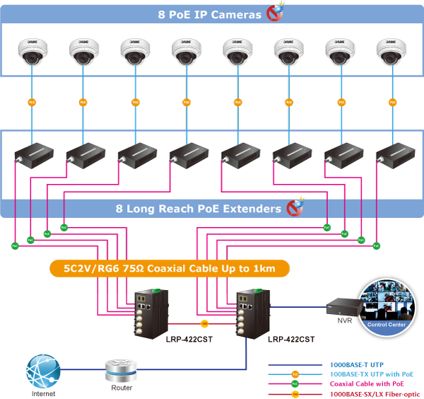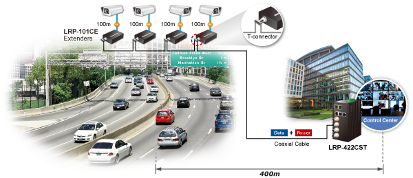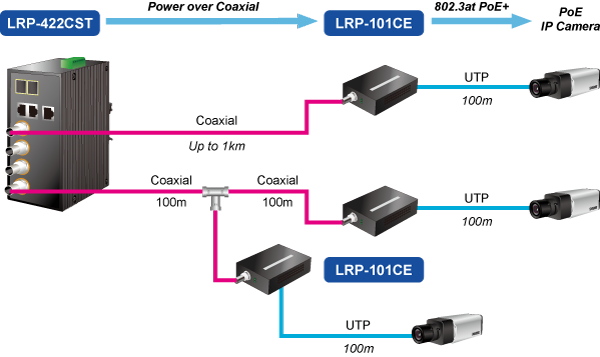 PLANET Long Reach PoE solution can easily build a power system for centrally-controlled IP cameras in a high availability network infrastructure. It gives users the flexibility to expand small area network with BNC T-connector for sharing four nodes per port when needed, making the LRP-422CST with 4 BNC Long Reach PoE Ports an ideal support for up to 16 PoE powered devices.