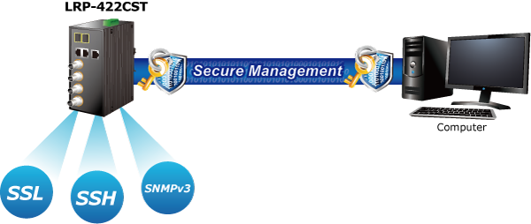 For efficient management, the LRP-422CST is equipped with console, Web, Telnet and SNMP management interfaces. With the built-in Web-based management interface, the LRP-422CST offers an easy-to-use, platform-independent management and configuration facility. By supporting the standard Simple Network Management Protocol (SNMP), the switch can be managed via any standard management software. For text-based management, the switch can be accessed via Telnet and the console port. Moreover, the LRP-422CST offers secure remote management by supporting SSH, SSL and SNMP v3 connections which encrypt the packet content at each session.