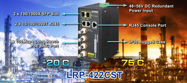 With IP30 aluminum industrial case protection, the LRP-422CST provides a high level of immunity against electromagnetic interference and heavy electrical surges which are usually found on plant floors or in curb-side traffic control cabinets. It also possesses an integrated power supply source with wide range of voltages (48 to 56V DC) for worldwide high availability applications requiring dual or backup power inputs. Being able to operate under the temperature range from -20 to 75 degrees C, the LRP-422CST can be placed in almost any difficult environment.