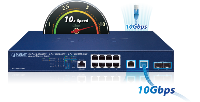 PLANET MGS-6311-10T2X is a brand-new Layer 3 managed multigigabit switch providing 2.5Gbps data over UTP cables, designed for the demand of high-bandwidth required network equipment, such as Wi-Fi 6 802.11ax wireless AP, NAS, workstation and those with 2.5GBASE-T interfaces. It features 8 10/100/1000/2500BASE-T copper ports, 2 100/1G/2.5G/5G/10GBASE-T copper ports and 2 extra 1G/10GBASE-X SFP+ fiber ports that are flexibly designed to extend the connection distance.