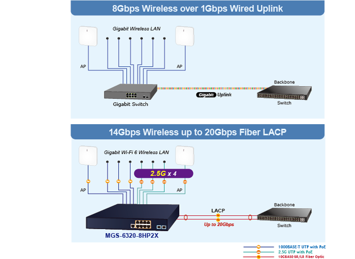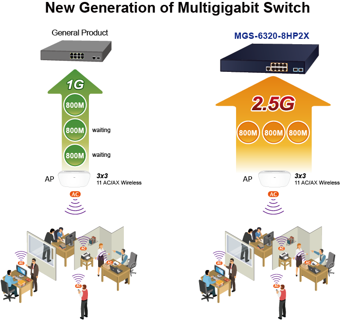 With the terminal access rates of 802.11ac wireless APs reaching as high as 1.2Gbps to 2.6Gbps, Gigabit ports have been unable to satisfy the demand. Supporting both 1Gbps and 2.5Gbps capability and 802.3af/at and 802.3bt PoE output, the MGS-6320-8HP2X can deliver not only data to 802.11ac wireless APs, but also power with the existing CAT5e Ethernet cables to other powered devices such as APs and IP cameras. It can definitely give you the speed you demand and its Plug and Play makes installation easy