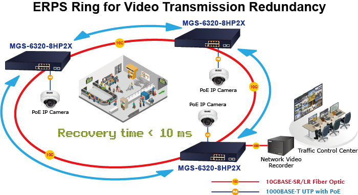 The MGS-6320-8HP2X supports redundant ring technology and features strong, rapid self-recovery capability to prevent interruptions and external intrusions. It incorporates advanced ITU-T G.8032 ERPS (Ethernet Ring Protection Switching) technology and Spanning Tree Protocol (802.1w RSTP) into customer’s network to enhance system reliability and uptime in harsh environments. In a certain simple Ring network, the recovery time could be less than 10ms to quickly bring the network back to normal operation.
