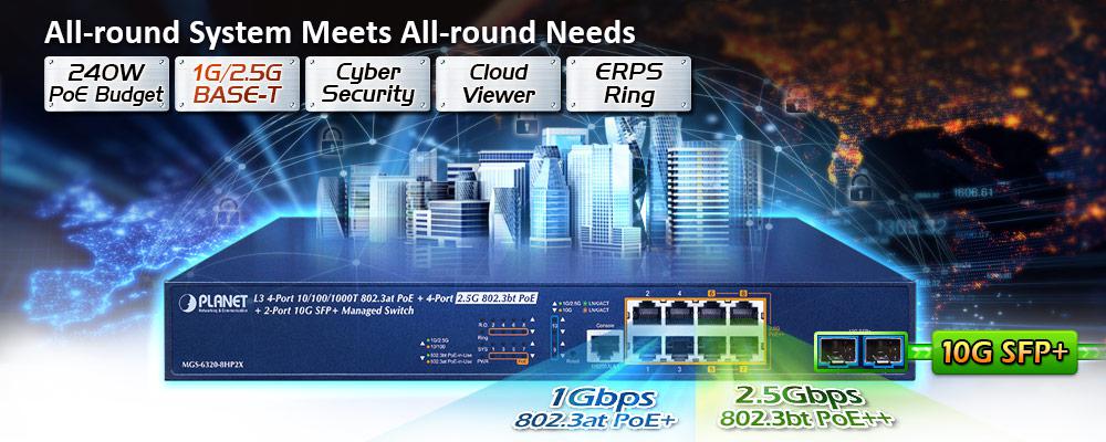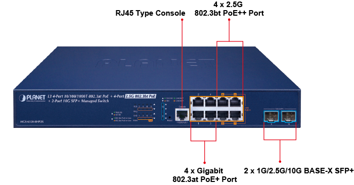 PLANET MGS-6320-8HP2X is a brand-new Layer 3 managed multigigabit switch providing 2.5Gbps data rate and 802.3bt PoE++ over UTP cables, designed for the demand of high-bandwidth required network equipment, such as Wi-Fi 6 802.11ax wireless AP, NAS, workstation and those with 2.5GBASE-T interfaces. It features 4 10/100/1000BASE-T copper ports with 802.3at PoE+ injector function, 4 100/1000/2500BASE-T copper ports with 802.3bt PoE++ injector function, a total PoE power budget of up to 240 watts and 2 extra 1G/2.5G/10GBASE-X SFP+ fiber ports that are flexibly designed to extend the connection distance. With such a favorable data link capability, hardware-based Layer 3 routing performance, Layer 2 and Layer 4 switching engine and user-friendly yet advanced IPv6/IPv4 management interfaces, it helps to accelerate the deployment of the next-generation IoT and wireless network for enterprises and smart cities.